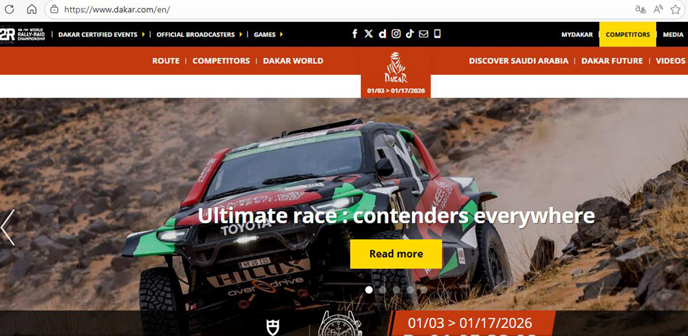 2026 다카르 랠리. 2026 dakar rally.다카르 랠리(Dakar Rally)는 2026년 jan 03일부터 17일까지 사우디아라비아에서 개최.The Dakar Rally isFrom Jan 03 to 17, 2026Held in Saudi Arabia. https://www.dakar.com/en/ https://www.youtube.com/watch?v=8gfqAJ6H7X4 --------- dakar 2026.01.02